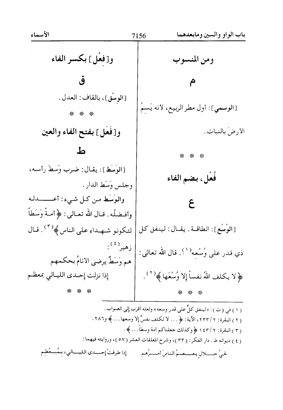 والوَسَط من كل شيء: أعد له وأفضلُه. قال اللّاه تعالى: أُمَّةً وَسَطاً لِتَكُونُوا شُهَدااءَ عَلَى النّااسِ «3». قال زهير «4»: