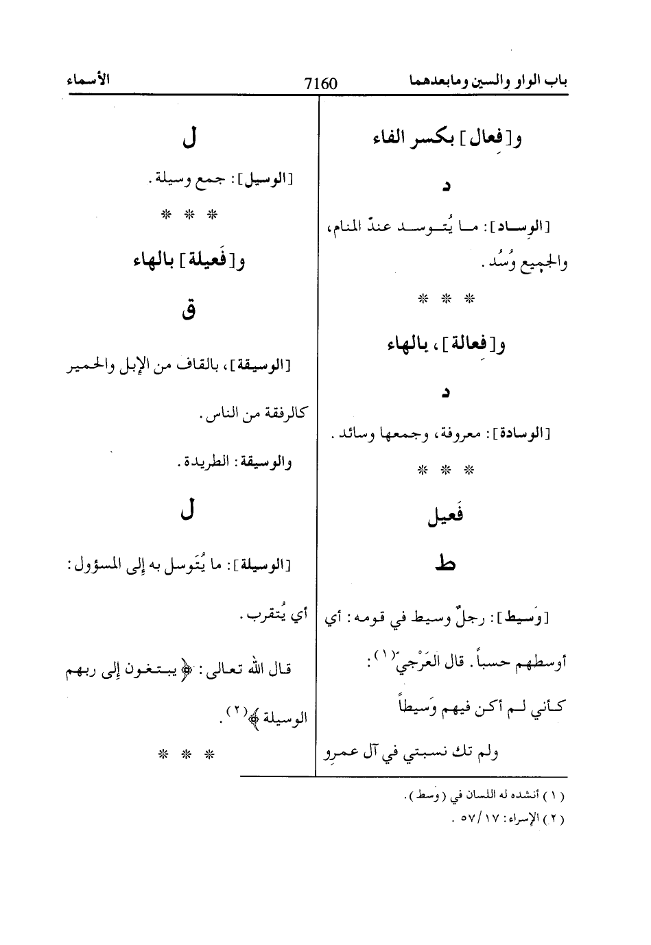 [وَسيط]: رجلٌ وسيط في قومه: أي أوسطهم حسباً. قال العَرْجيّ «1»: