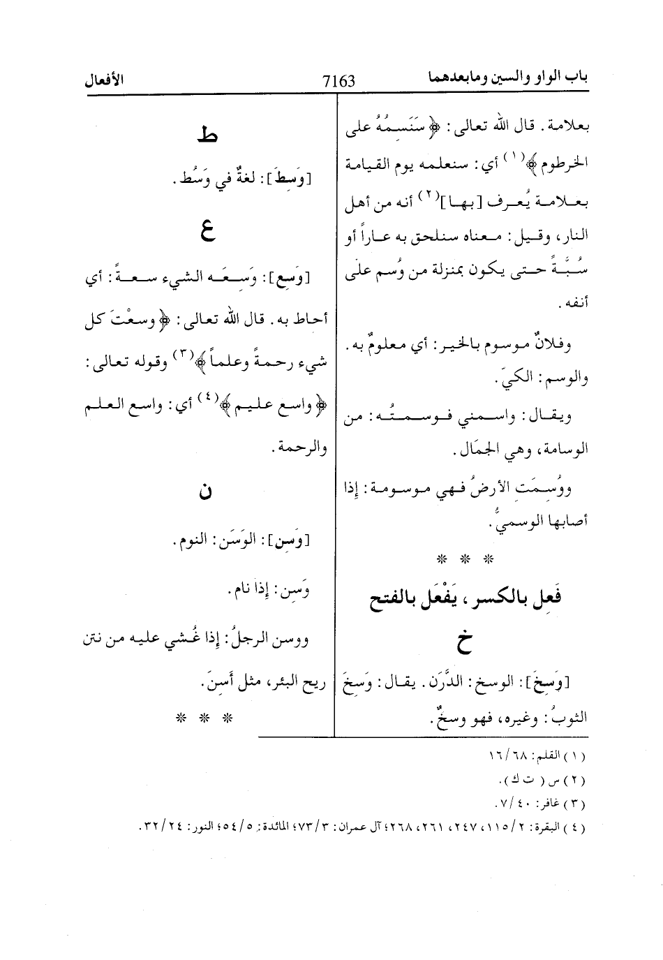 [وَسِع]: وَسِعَه الشيء سعةً: أي أحاط به. قال اللّاه تعالى: وَسِعْتَ كُلَّ شَيْءٍ رَحْمَةً وَعِلْماً «3» وقوله تعالى: