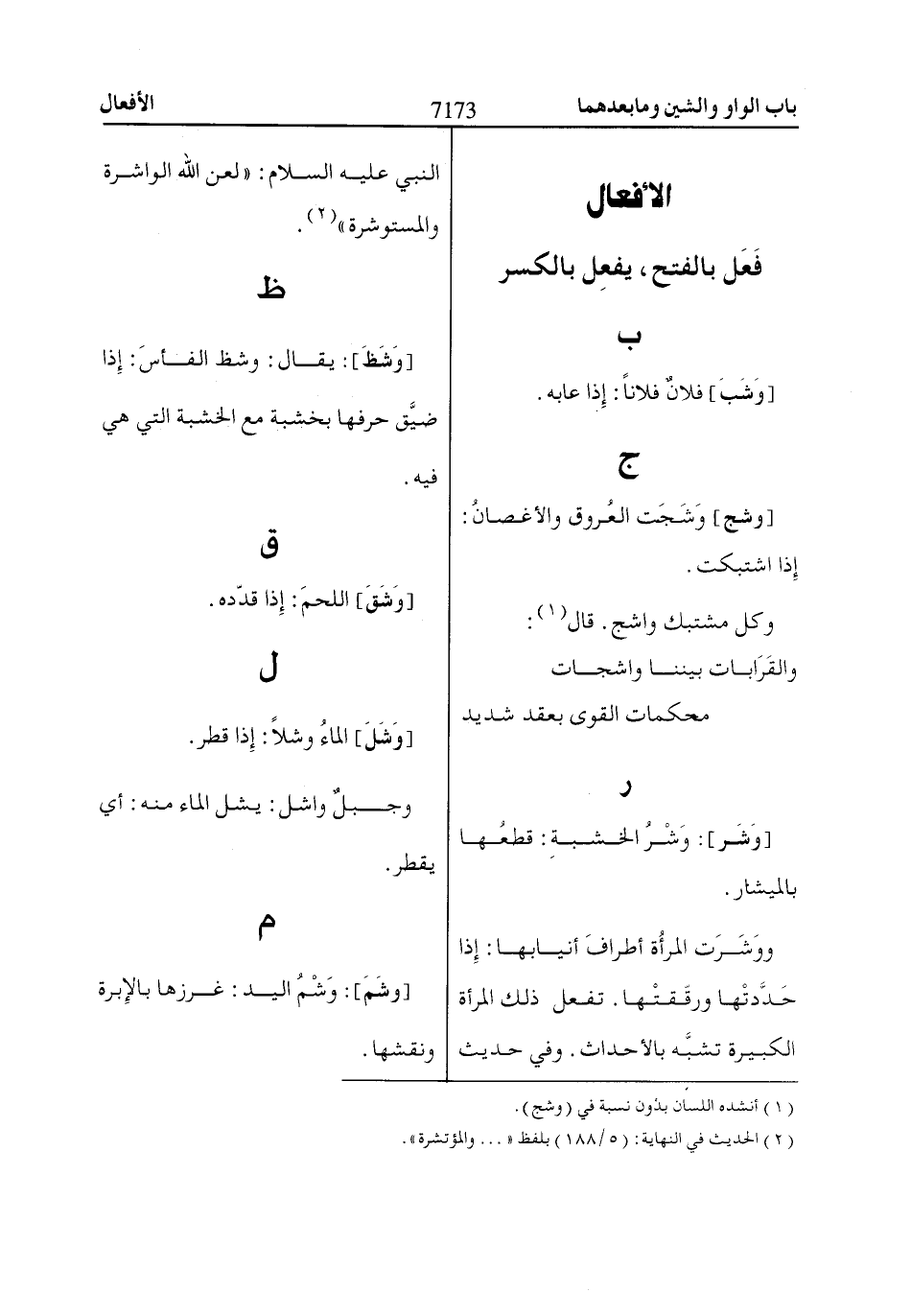 ووَشَرَت المرأُة أطرافَ أنيابها: إِذا حَدَّدتْها ورقّقتْها. تفعل ذلك المرأة الكبيرة تشبَّه بالأحداث.