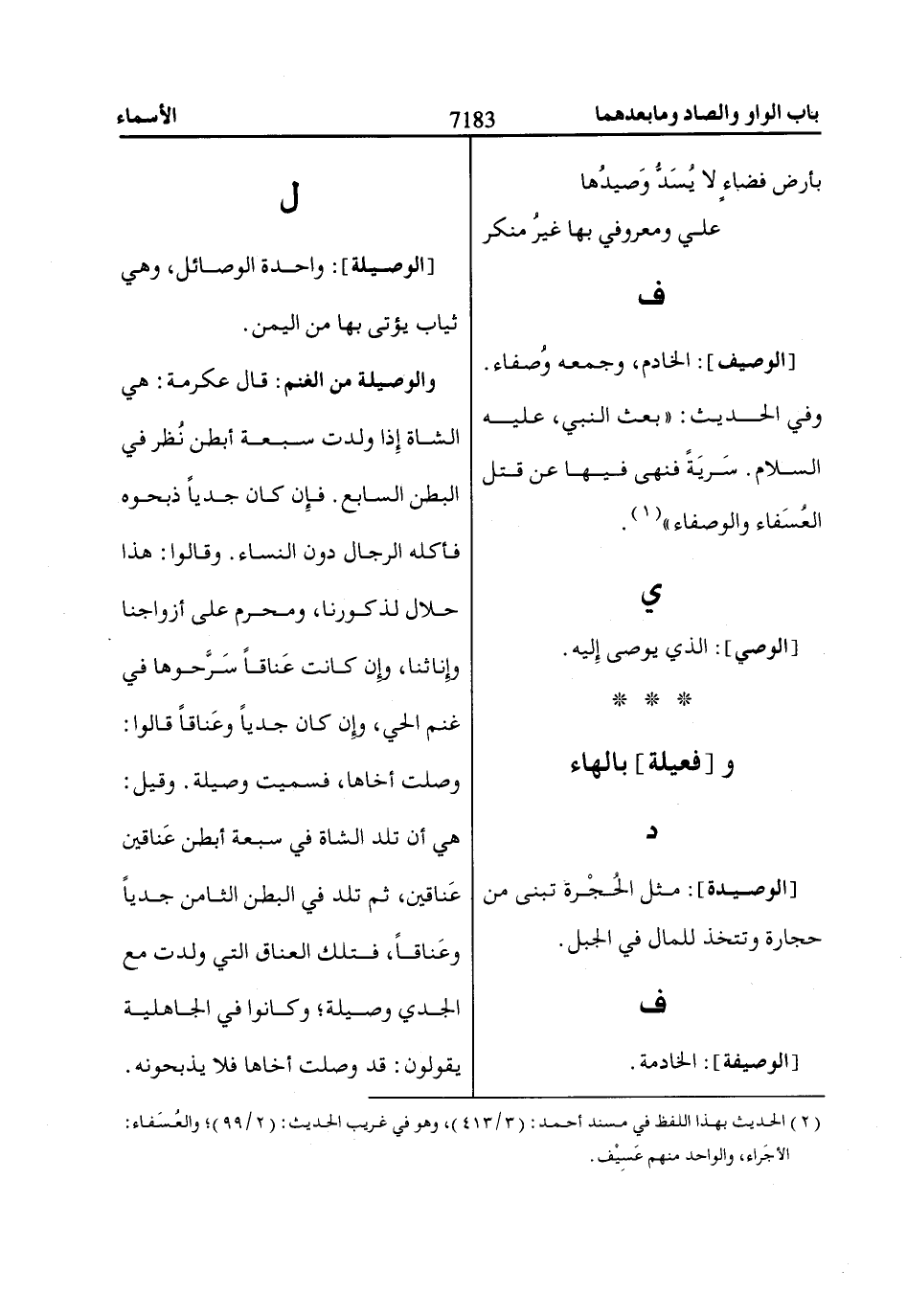 هي أن تلد الشاة في سبعة أبطن عَناقين عَناقين، ثم تلد في البطن الثامن جدياً وعَناقاً، فتلك العناق التي ولدت مع الجدي وصيلة؛ وكانوا في الجاهلية يقولون: قد وصلت أخاها فلا يذبحونه.