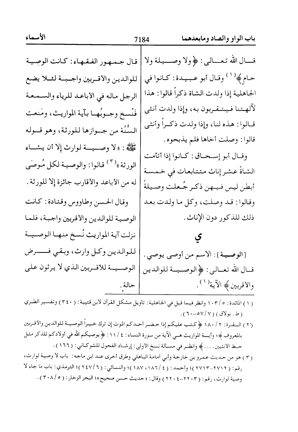 (2) البقرة: 2/ 180 كُتِبَ عَلَيْكُمْ إِذاا حَضَرَ أَحَدَكُمُ الْمَوْتُ إِنْ تَرَكَ خَيْراً الْوَصِيَّةُ لِلْواالِدَيْنِ وَالْأَقْرَبِينَ بِالْمَعْرُوفِ؛ وآية المواريث هي الآية من سورة النساء: 4/ 11: يُوصِيكُمُ اللّاهُ فِي أَوْلاادِكُمْ لِلذَّكَرِ مِثْلُ حَظِّ الْأُنْثَيَيْنِ .... وانظر في مسألة نسخ الأولى: إِرشاد الفحول للشوكاني: (166).