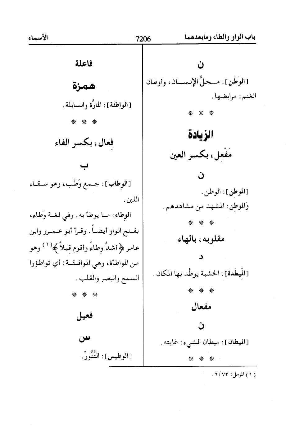 الوِطاء: ما يوطأ به. وفي لغة وَطاء، بفتح الواو أيضاً. وقرأ أبو عمرو وابن عامر أشدُّ وِطاءً وأقوم قِيلًا «1» وهو من المواطأة، وهي الموافقة: أي تواطؤوا السمع والبصر والقلب.