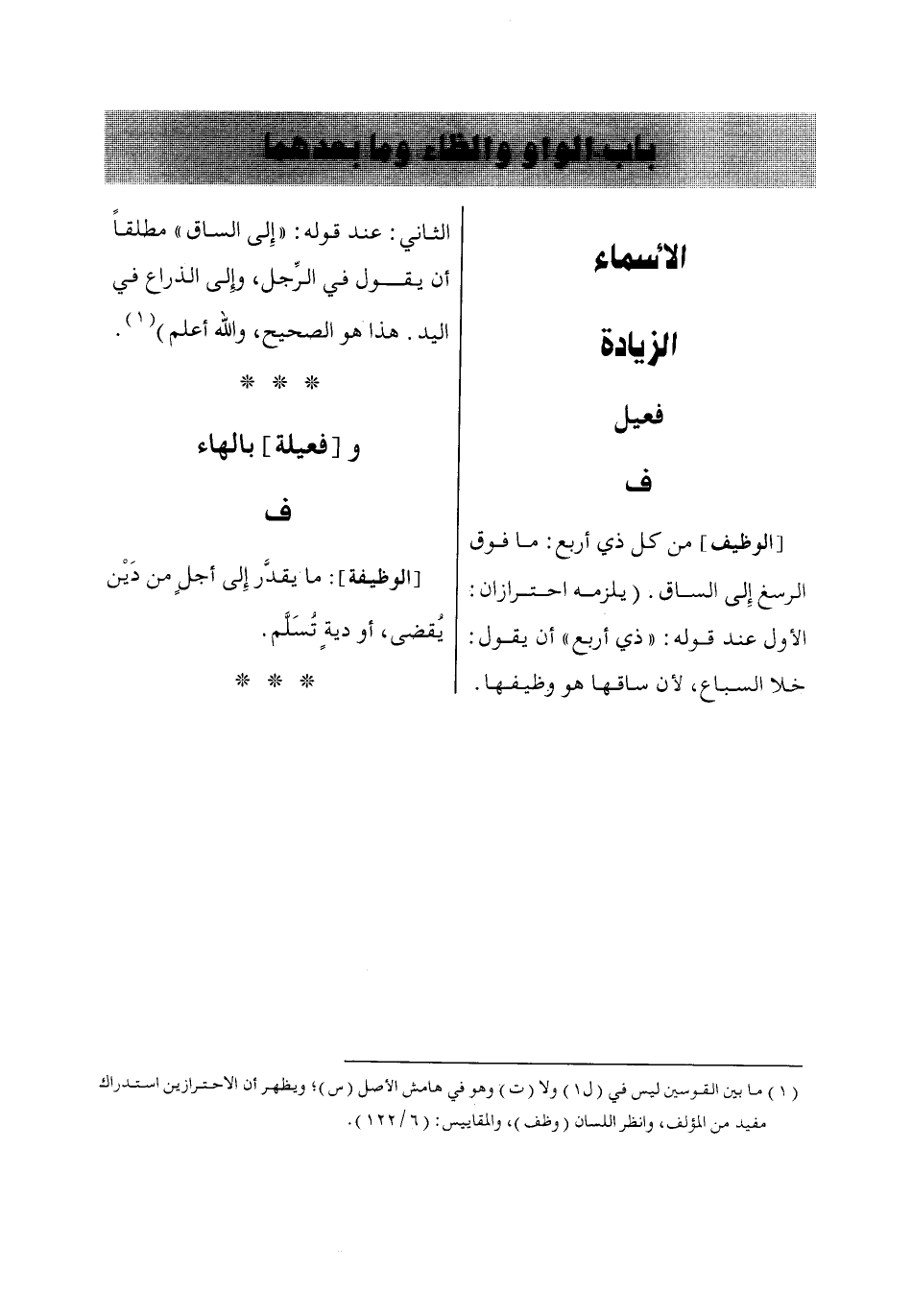 (1) ما بين القوسين ليس في (ل 1) ولا (ت) وهو في هامش الأصل (س)؛ ويظهر أن الاحترازين استدراك مفيد من المؤلف، وانظر اللسان (وظف)، والمقاييس: (6/ 122).