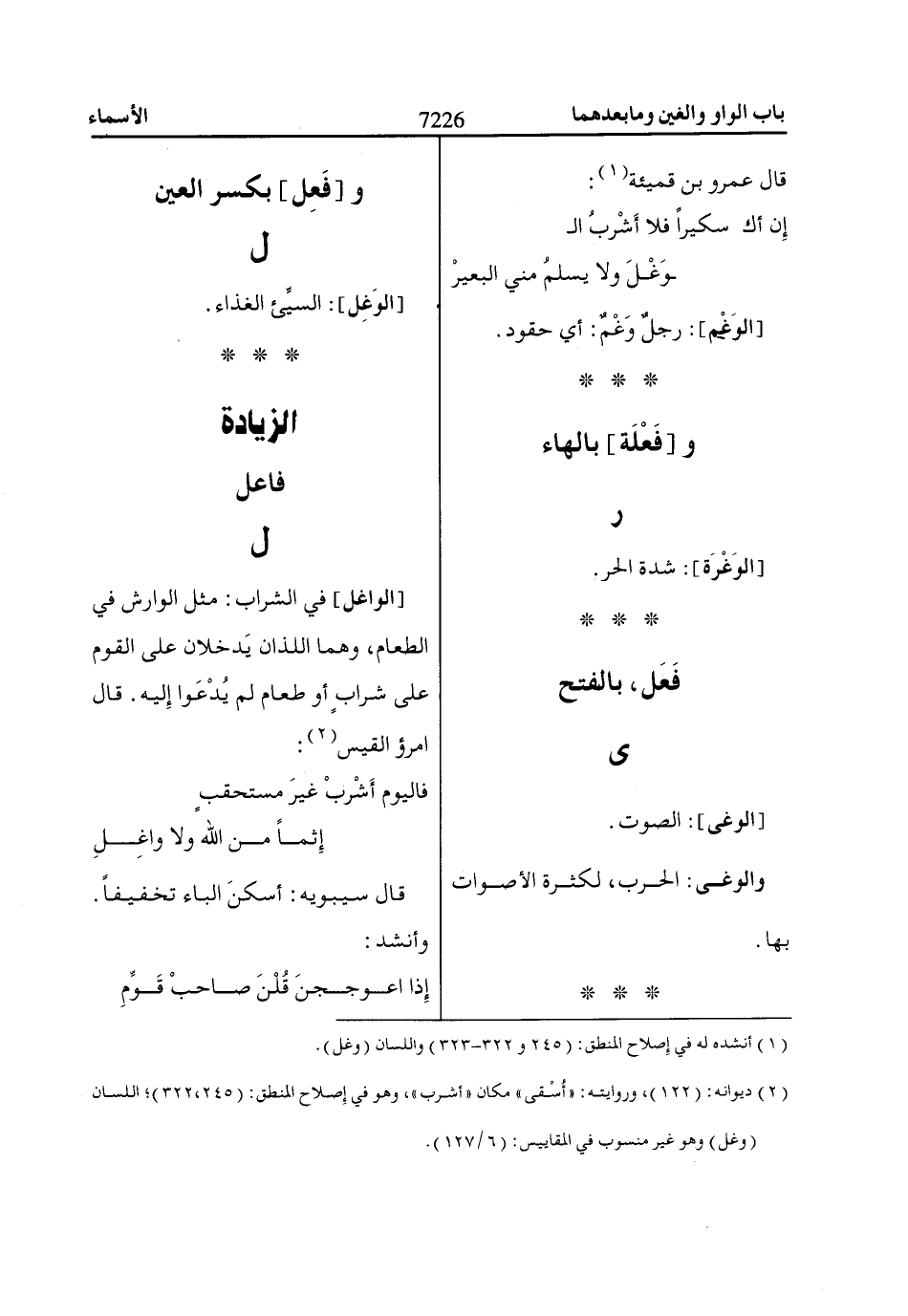 (2) ديوانه: (122)، وروايته: «أُسقى» مكان «أشرب»، وهو في إِصلاح المنطق: (245، 322)؛ اللسان (وغل) وهو غير منسوب في المقاييس: (6/ 127).
