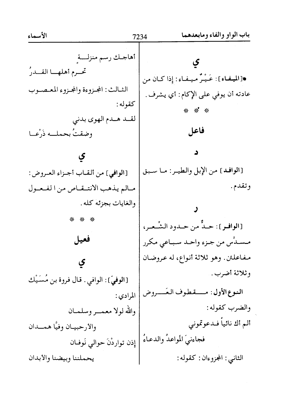 [الوافر]: حدٌّ من حدود الشِّعر، مسدَّس من جزء واحد سباعي مكرر مفاعلتن. وهو ثلاثة أنواع، له عروضان وثلاثة أضرب.