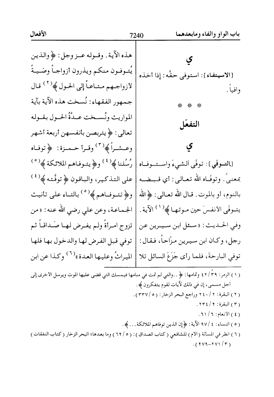 [التوفّي]: توفّى الشيءَ واستوفاه بمعنىً. وتوفّاه اللّاه تعالى: أي قبضه بالنوم، أو بالموت. قال اللّاه تعالى: اللّاهُ يَتَوَفَّى الْأَنْفُسَ حِينَ مَوْتِهاا «1» الآية.