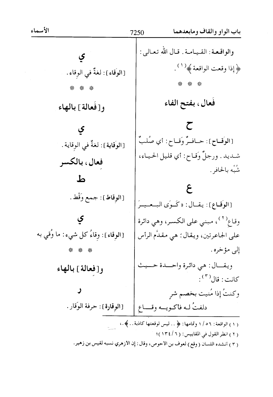 [الوَقاع]: يقال: «كَوَى البعيرَ وقاعِ «2»، مبني على الكسر، وهي دائرة على الجاعرتين، ويقال: هي مقدَّم الرأس إِلى مؤخره.