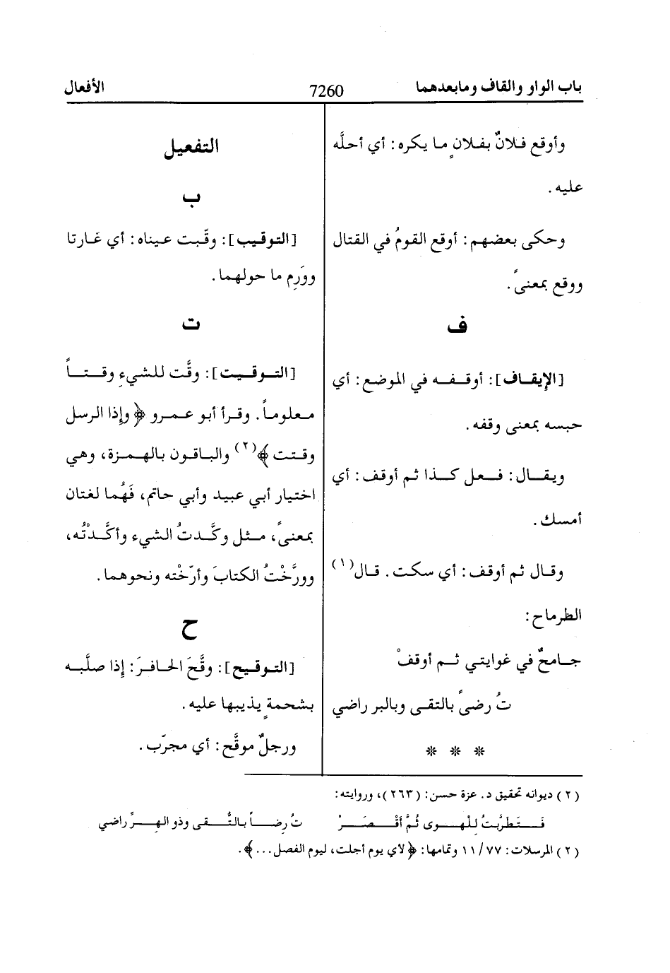 [التوقيت]: وقَّت للشيءِ وقتاً معلوماً. وقرأ أبو عمرو وإِذا الرسل وقتت «2» والباقون بالهمزة، وهي اختيار أبي عبيد وأبي حاتم، فَهُما لغتان بمعنىً، مثل وكَّدتُ الشيء وأكَّدْتُه، وورَّخْتُ الكتابَ وأرّخْته ونحوهما.