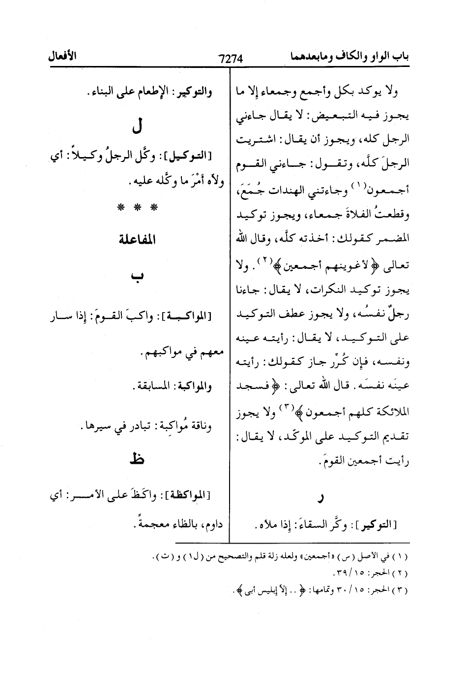 ولا يوكد بكل وأجمع وجمعاء إِلا ما يجوز فيه التبعيض: لا يقال جاءني الرجل كله، ويجوز أن يقال: اشتريت الرجلَ كلَّه، وتقول: جاءني القوم أجمعون «1» وجاءتني الهندات جُمَعَ، وقطعتُ الفلاةَ جمعاء، ويجوز توكيد المضمر كقولك: أخذته كلَّه، وقال اللّاه تعالى لَأُغْوِيَنَّهُمْ أَجْمَعِينَ* «2». ولا يجوز توكيد النكرات، لا يقال: جاءنا رجلٌ نفسُه، ولا يجوز عطف التوكيد على التوكيد، لا يقال: رأيته عينه ونفسه، فإِن كُرِّر جاز كقولك: رأيته عينَه نفسَه. قال اللّاه تعالى: فَسَجَدَ الْمَلاائِكَةُ كُلُّهُمْ أَجْمَعُونَ* «3» ولا يجوز تقديم التوكيد على الموكّد، لا يقال: