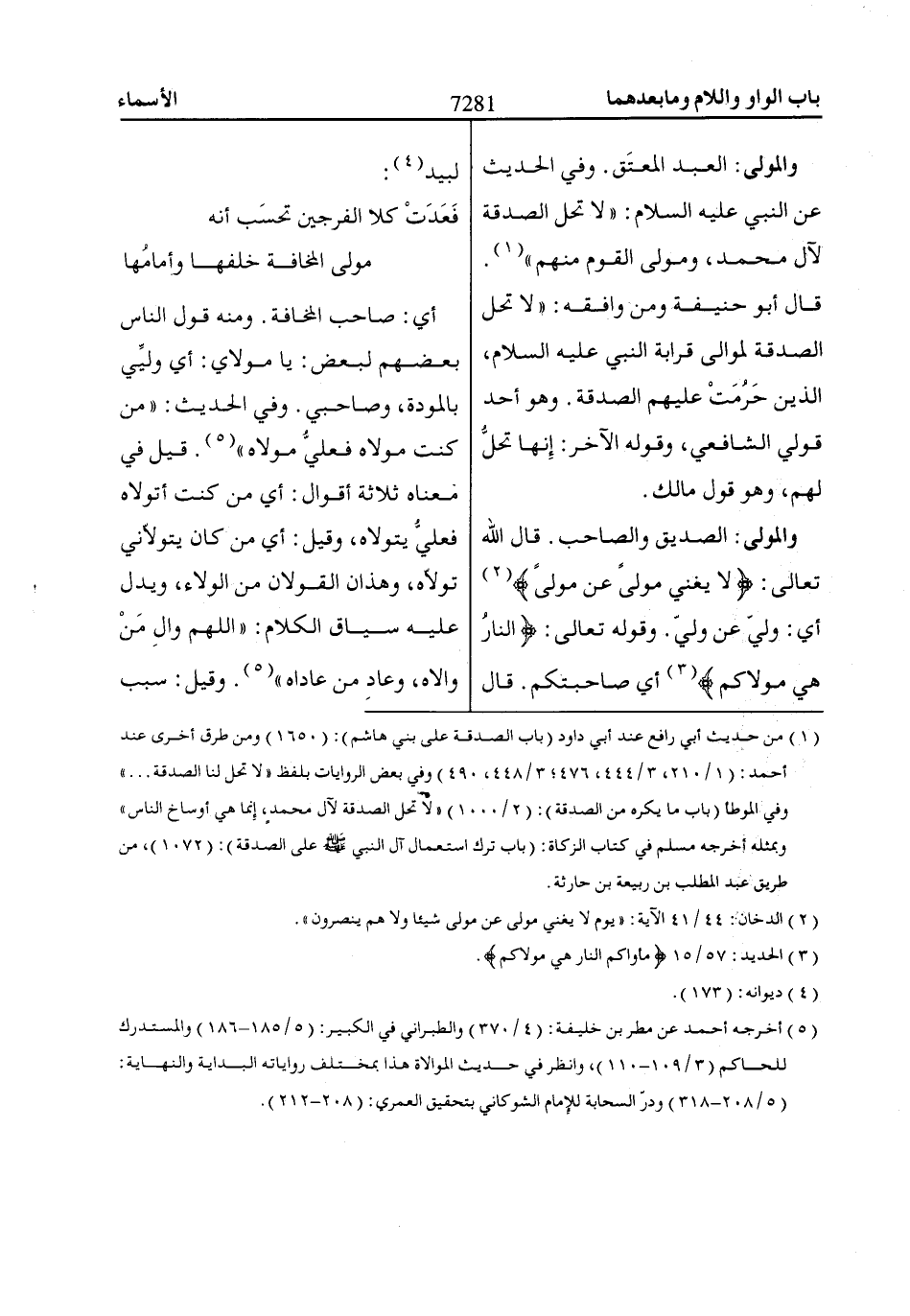والمولى: الصديق والصاحب. قال اللّاه تعالى: لاا يُغْنِي مَوْلًى عَنْ مَوْلًى «2» أي: وليّ عن وليّ. وقوله تعالى: النّاارُ هِيَ مَوْلااكُمْ «3» أي صاحبتكم. قال لبيد «4»: