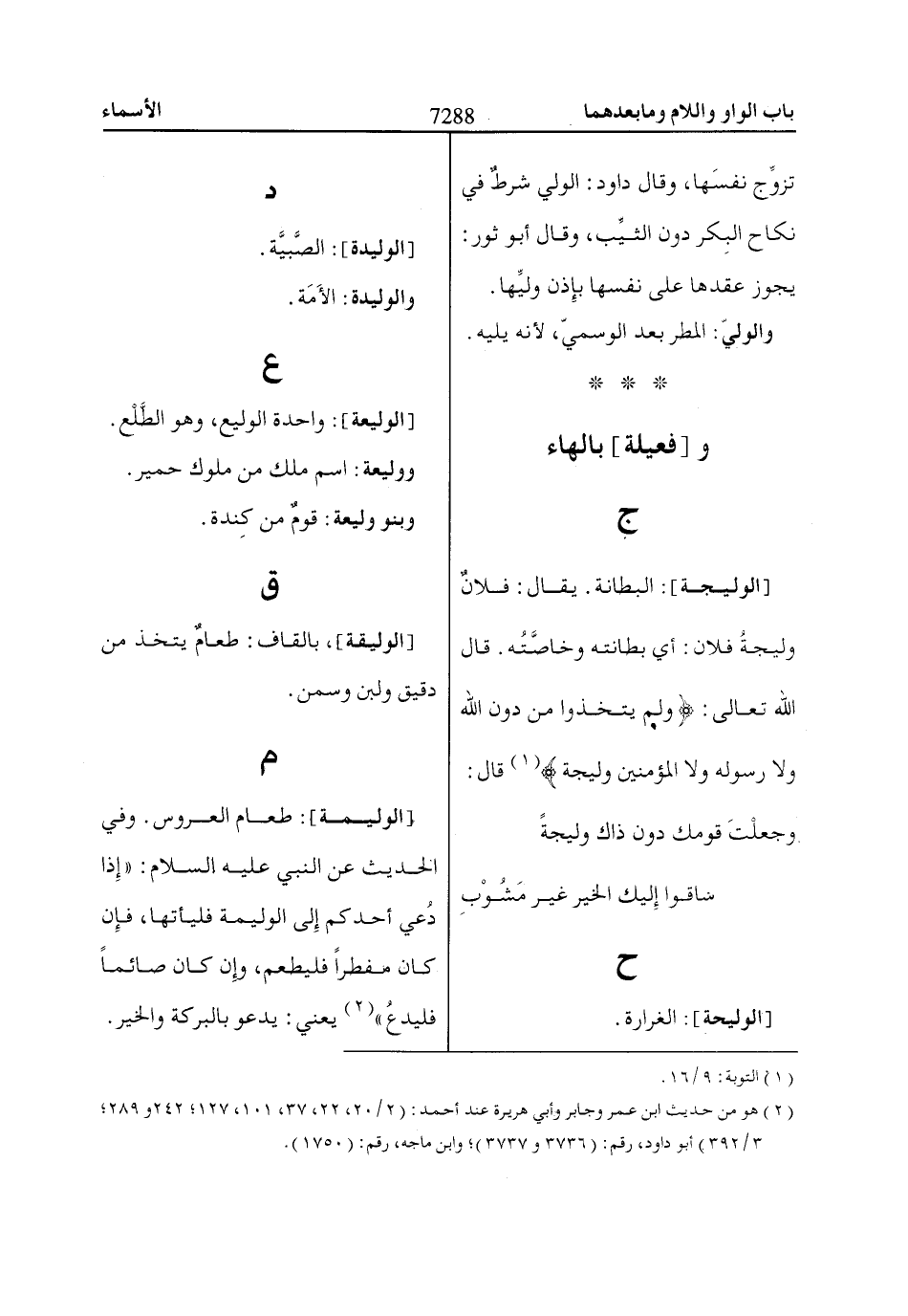 [الوليجة]: البطانة. يقال: فلانٌ وليجةُ فلان: أي بطانته وخاصَّتُه. قال اللّاه تعالى: وَلَمْ يَتَّخِذُوا مِنْ دُونِ اللّاهِ وَلاا رَسُولِهِ وَلَا الْمُؤْمِنِينَ وَلِيجَةً «1» قال: