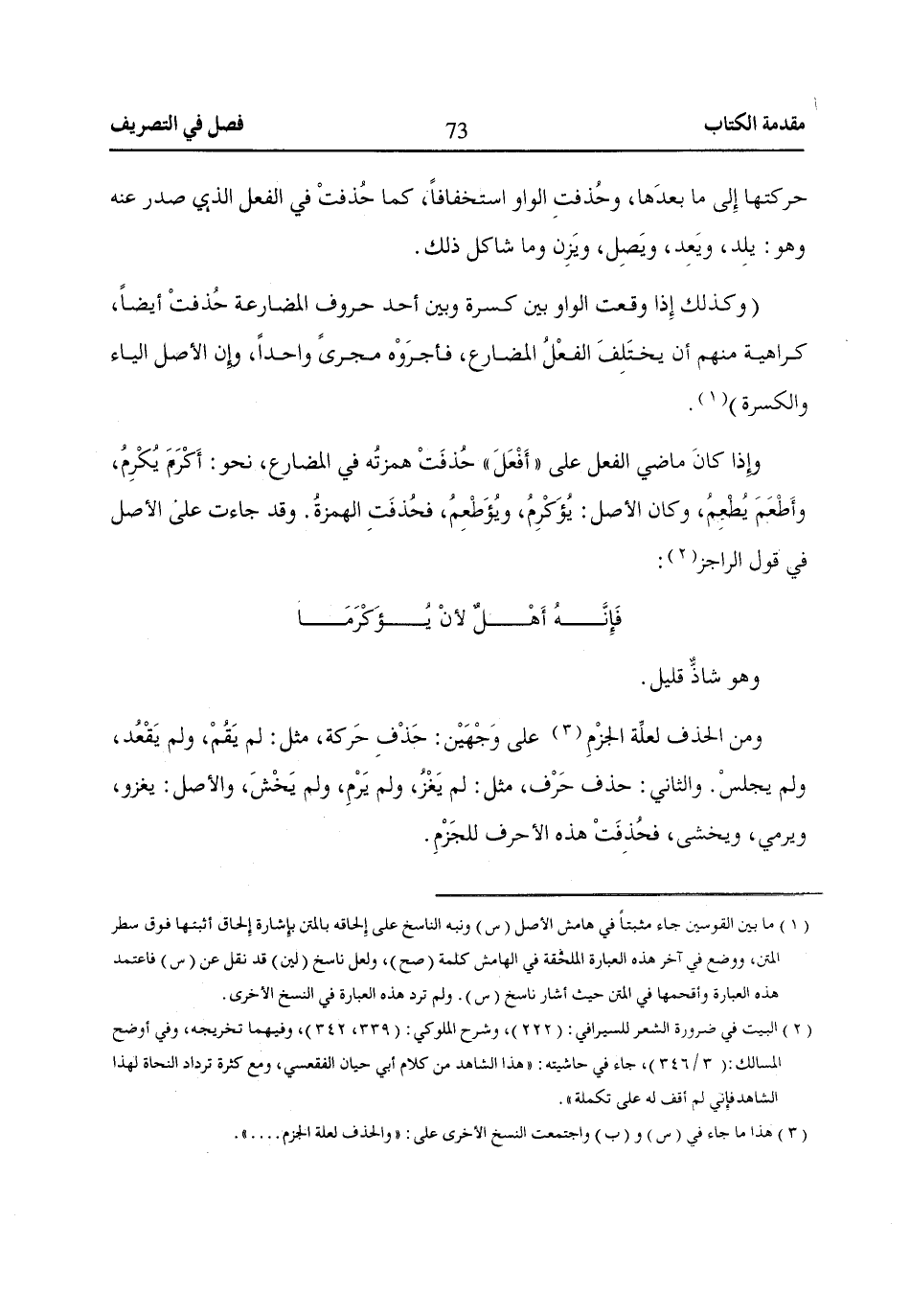(3) هذا ما جاء في (س) و (ب) واجتمعت النسخ الأخرى على: «والحذف لعلة الجزم ... ».