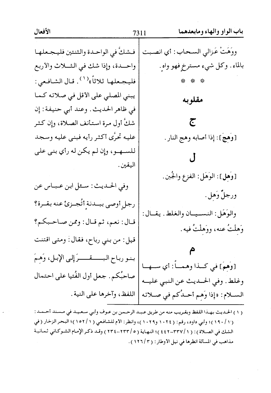 وفي الحديث عن النبي عليه السلام: «إِذا وَهِم أحدُكم في صلاته فشكَّ في الواحدة والثنتين فليجعلها واحدة، وإِذا شك في الثلاث والأربع فليجعلها ثلاثاً» «1»
