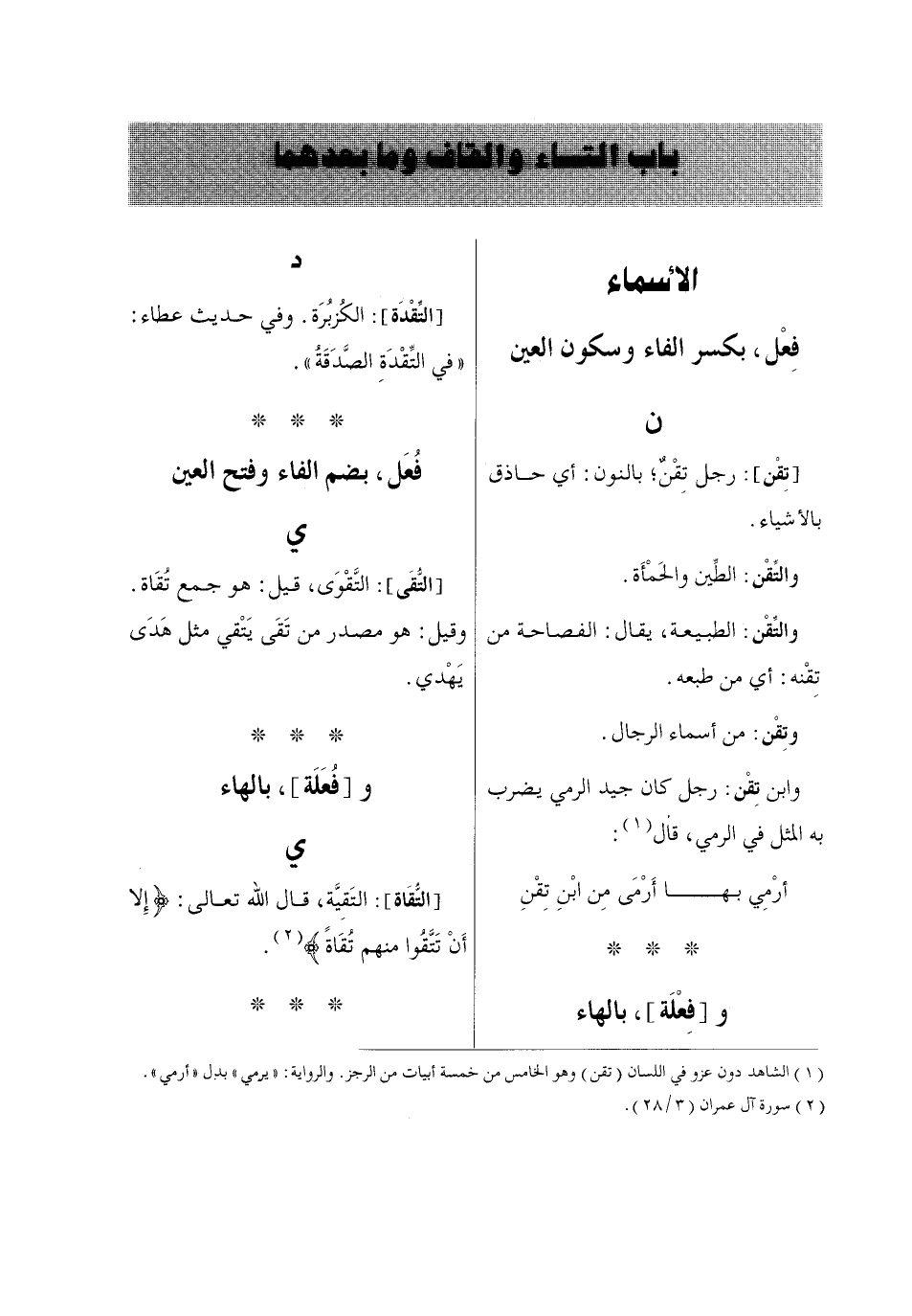 [التُّقَاة]: التَقِيَّة، قال اللّاه تعالى: إِلّاا أَنْ تَتَّقُوا مِنْهُمْ تُقااةً «2».