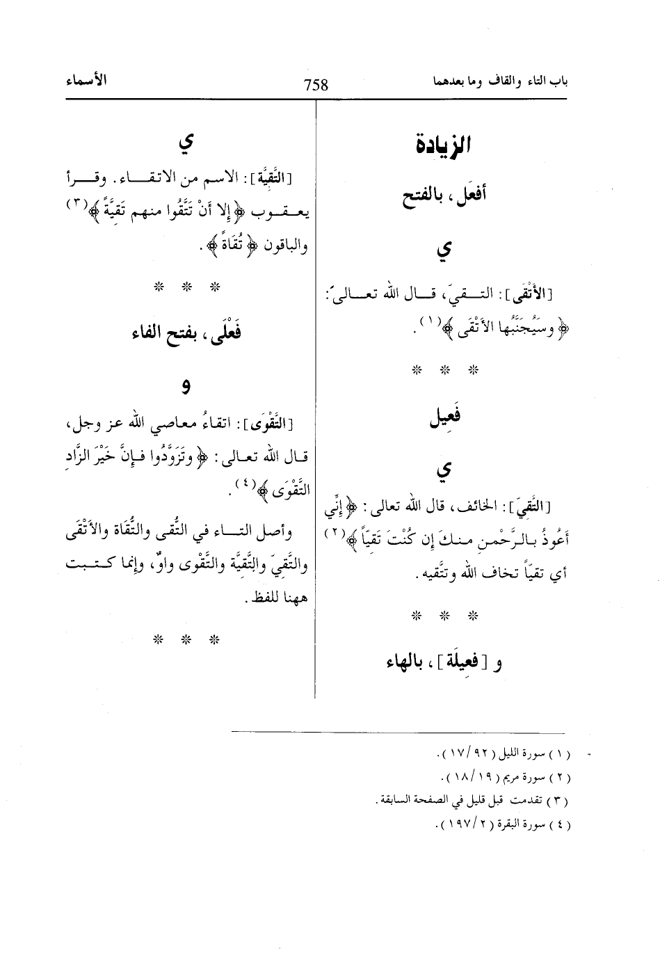 [التَّقِيّ]: الخائف، قال اللّاه تعالى: إِنِّي أَعُوذُ بِالرَّحْمانِ مِنْكَ إِنْ كُنْتَ تَقِيًّا «2» أي تقيّاً تخاف اللّاه وتتَّقيه.