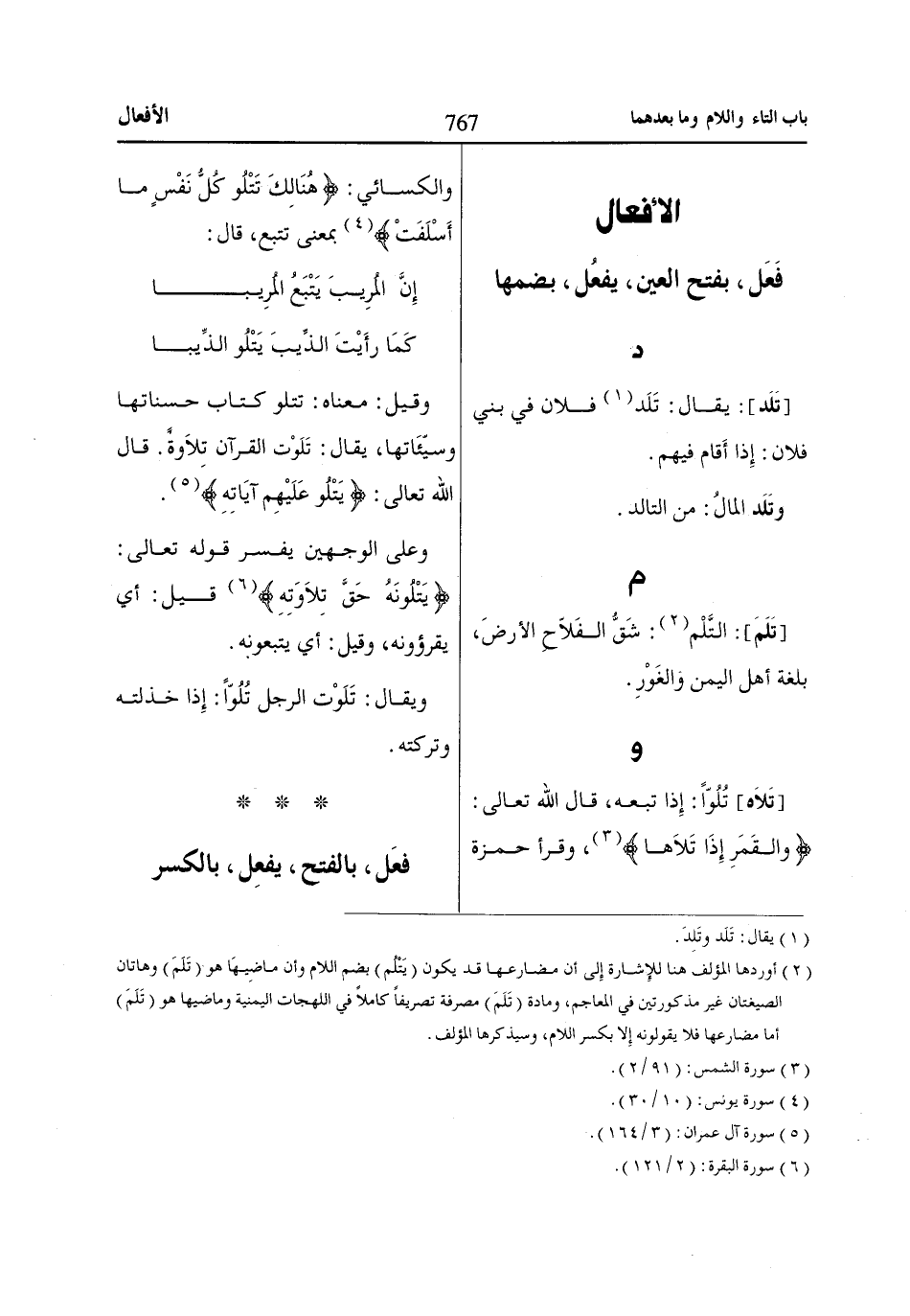 (2) أوردها المؤلف هنا للإِشارة إلى أن مضارعها قد يكون (يَتْلُم) بضم اللام وأن ماضِيهَا هو (تَلَمَ) وهاتان الصيغتان غير مذكورتين في المعاجم، ومادة (تَلَمَ) مصرفة تصريفاً كاملًا في اللهجات اليمنية وماضيها هو (تَلَمَ) أما مضارعها فلا يقولونه إِلا بكسر اللام، وسيذكرها المؤلف.