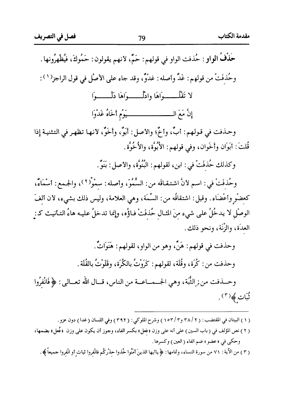 وكذلك حُذِفَتْ في: ابن، لقولهم: البُنُوَّة، والأصل: بَنَوٌ.