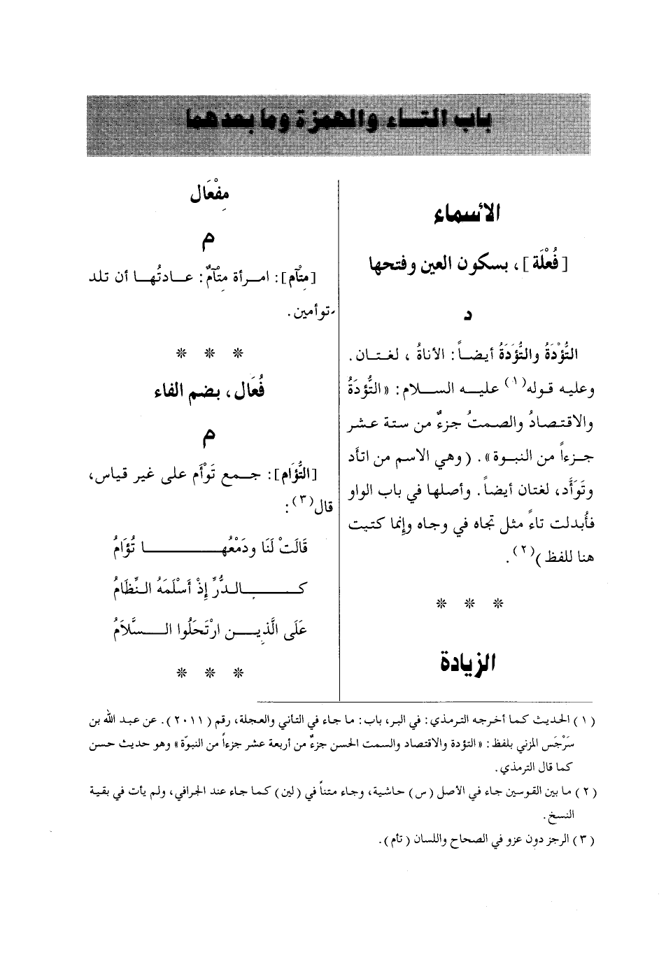 (وهي الاسم من اتأَد وتَوَأَّد، لغتان أيضاً. وأصلها في باب الواو فأُبدلت تاءً مثل تجاه في وجاه وإِنما كتبت هنا للفظ) «2».