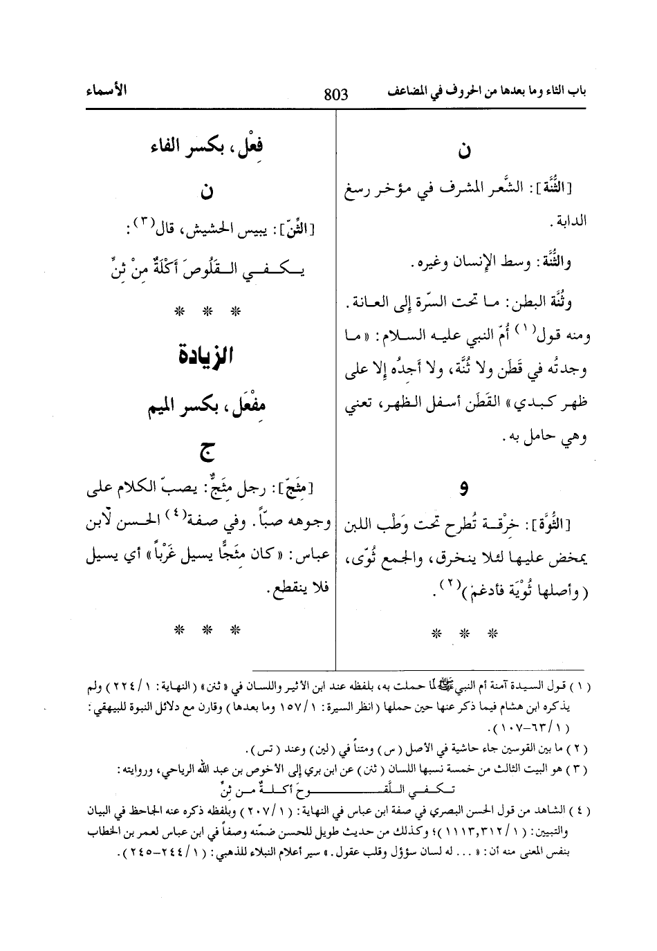 (1) قول السيدة آمنة أم النبي صَلى الله عَليه وسلم لمّا حملت به، بلفظه عند ابن الأثير واللسان في «ثنن» (النهاية: 1/ 224) ولم يذكره ابن هشام فيما ذكر عنها حين حملها (انظر السيرة: 1/ 157 وما بعدها) وقارن مع دلائل النبوة للبيهقي: