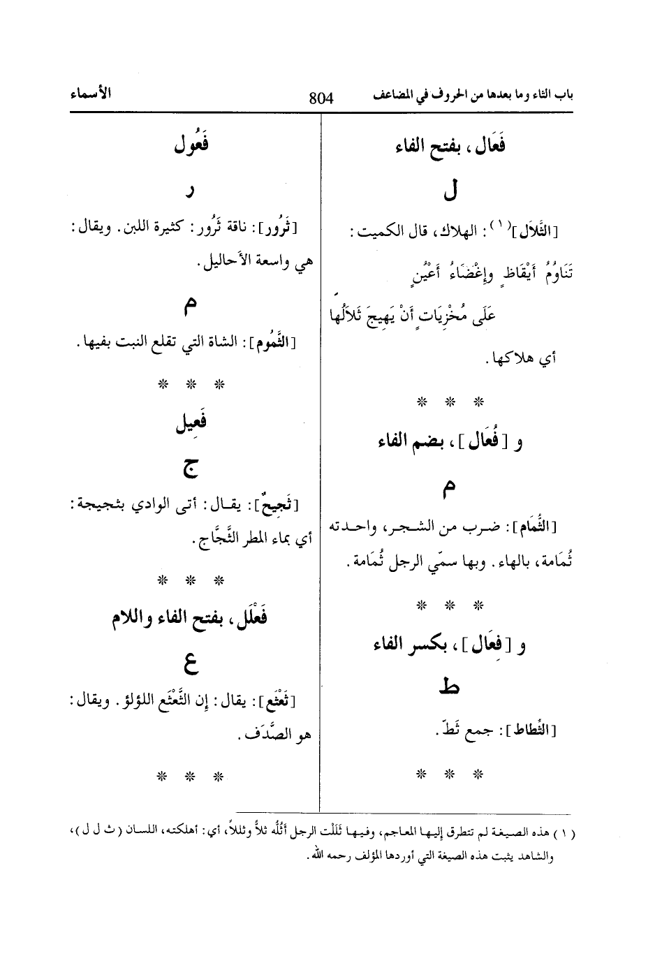 (1) هذه الصيغة لم تتطرق إِليها المعاجم، وفيها ثَلَلْت الرجل أَثُلُّه ثلًّا وثللًا، أي: أهلكته، اللسان (ث ل ل)، والشاهد يثبت هذه الصيغة التي أوردها المؤلف رحمه اللّاه.