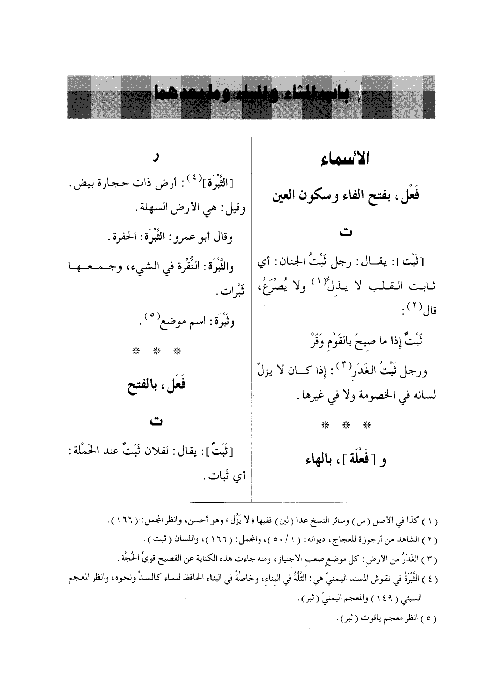 (2) الشاهد من أرجوزة للعجاج، ديوانه: (1/ 50)، والمجمل: (166)، واللسان (ثبت).