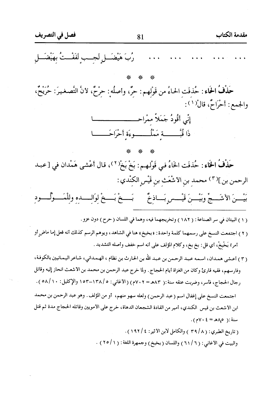 حُذفَت الخَاءُ في قَوْلهم: بَخْ بَخْ «2»، قال أَعْشى هَمْدان في [عبد الرحمن بن] «3» محمدِ بنِ الأشْعَثِ بنِ قَيْسٍ الكِنْدي: