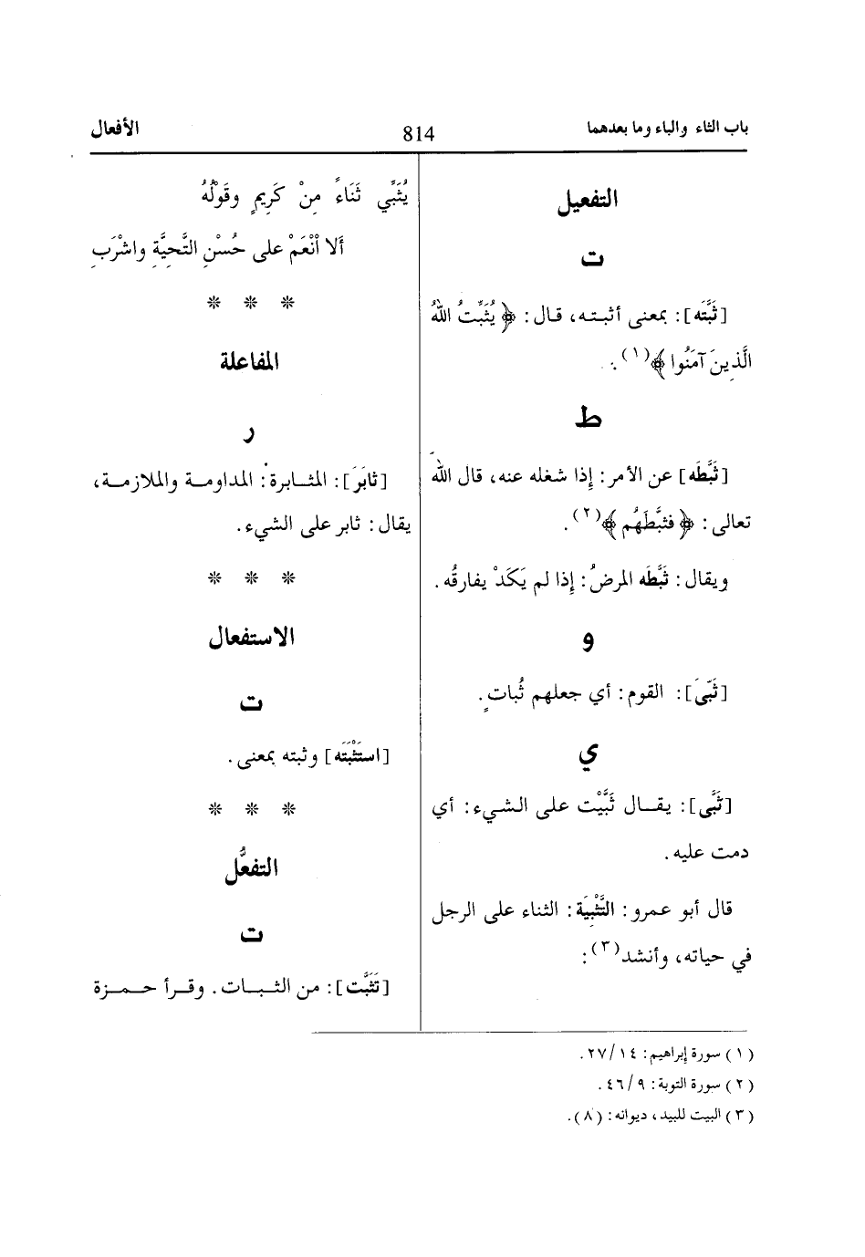 قال أبو عمرو: التَّثْبِيَة: الثناء على الرجل في حياته، وأنشد «3»: