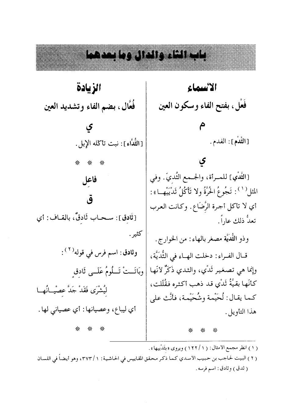 (2) البيت لحاجب بن حبيب الأسدي كما ذكر محقق المقاييس في الحاشية: 1/ 373، وهو أيضاً في اللسان (ثدق) وثادق: اسم فرسه.