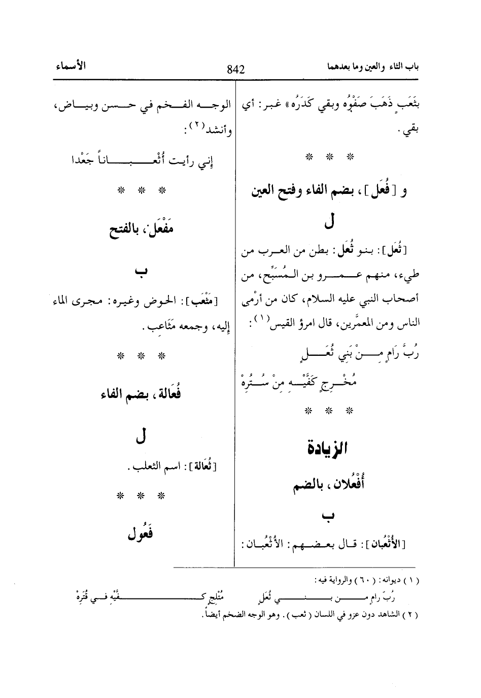 [ثُعَل]: بنو ثُعَل: بطن من العرب من طيء، منهم عمرو بن المُسَبِّح، من أصحاب النبي عليه السلام، كان من أرْمى الناس ومن المعمَّرين، قال امرؤ القيس «1»: