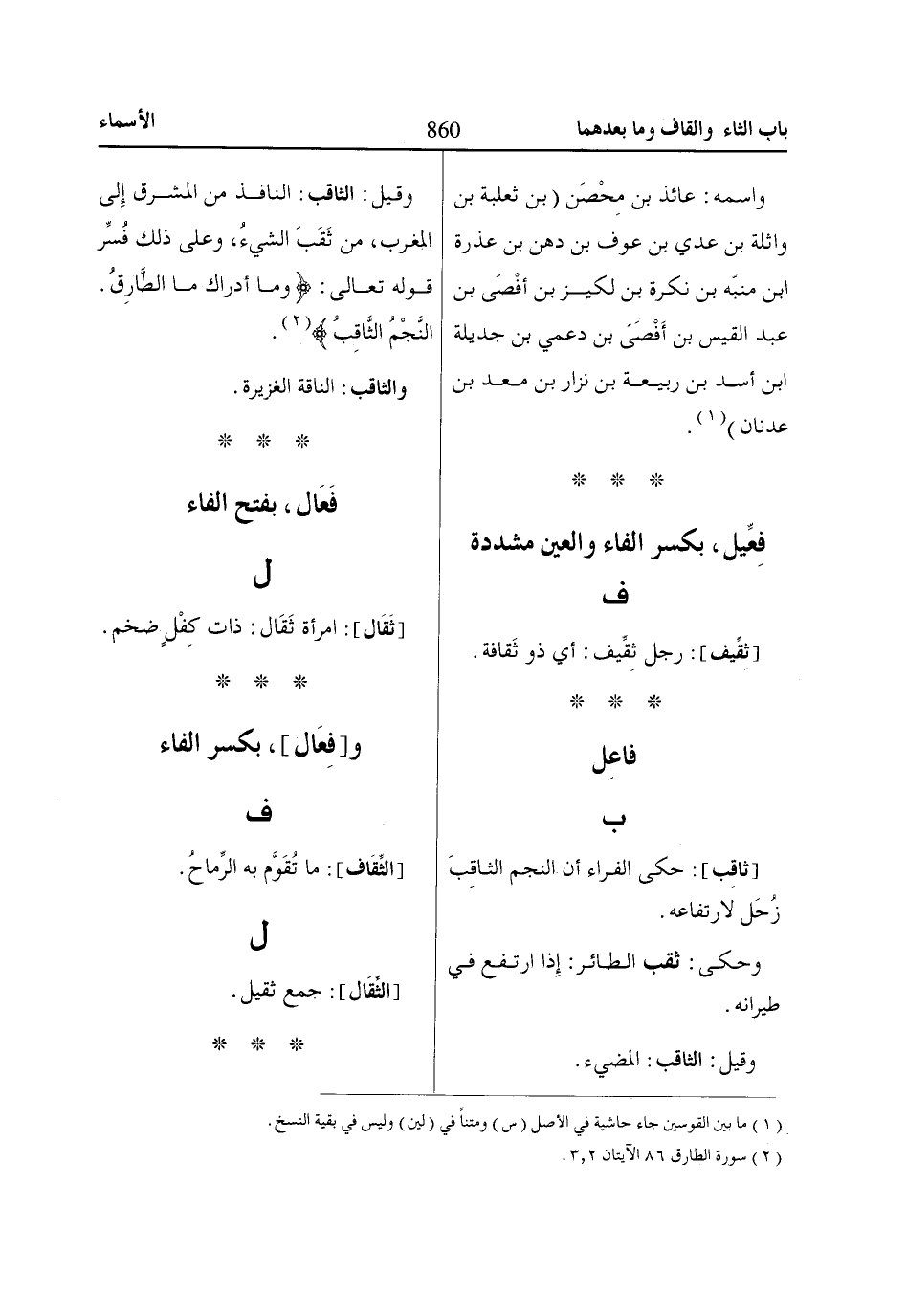 [ثاقِب]: حكى الفراء أن النجم الثاقِبَ زُحَل لارتفاعه.