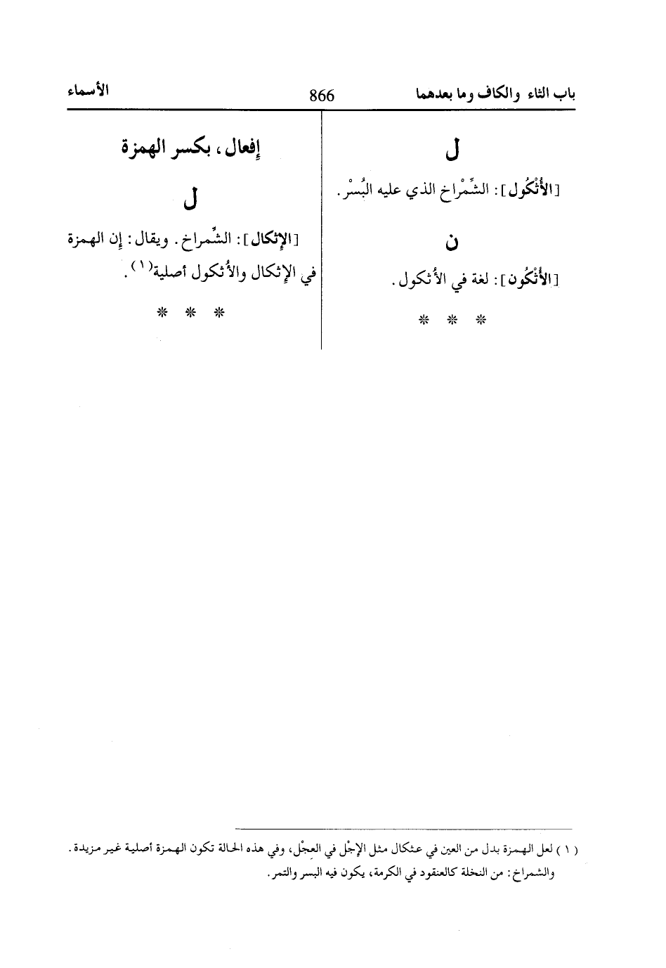 (1) لعل الهمزة بدل من العين في عثكال مثل الإِجْل في العِجْل، وفي هذه الحالة تكون الهمزة أصلية غير مزيدة.