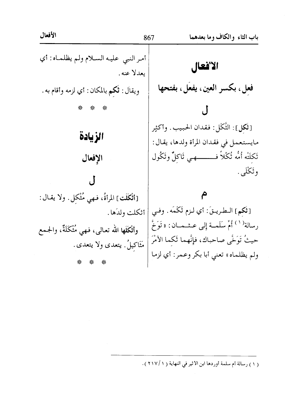 وفي رسالة «1» أُمِّ سَلَمة إِلى عثمان: «تَوَخَّ حيثُ تَوَخَّى صاحباك، فإِنَّهما ثَكِما الأَمْرَ ولم يظلماه»