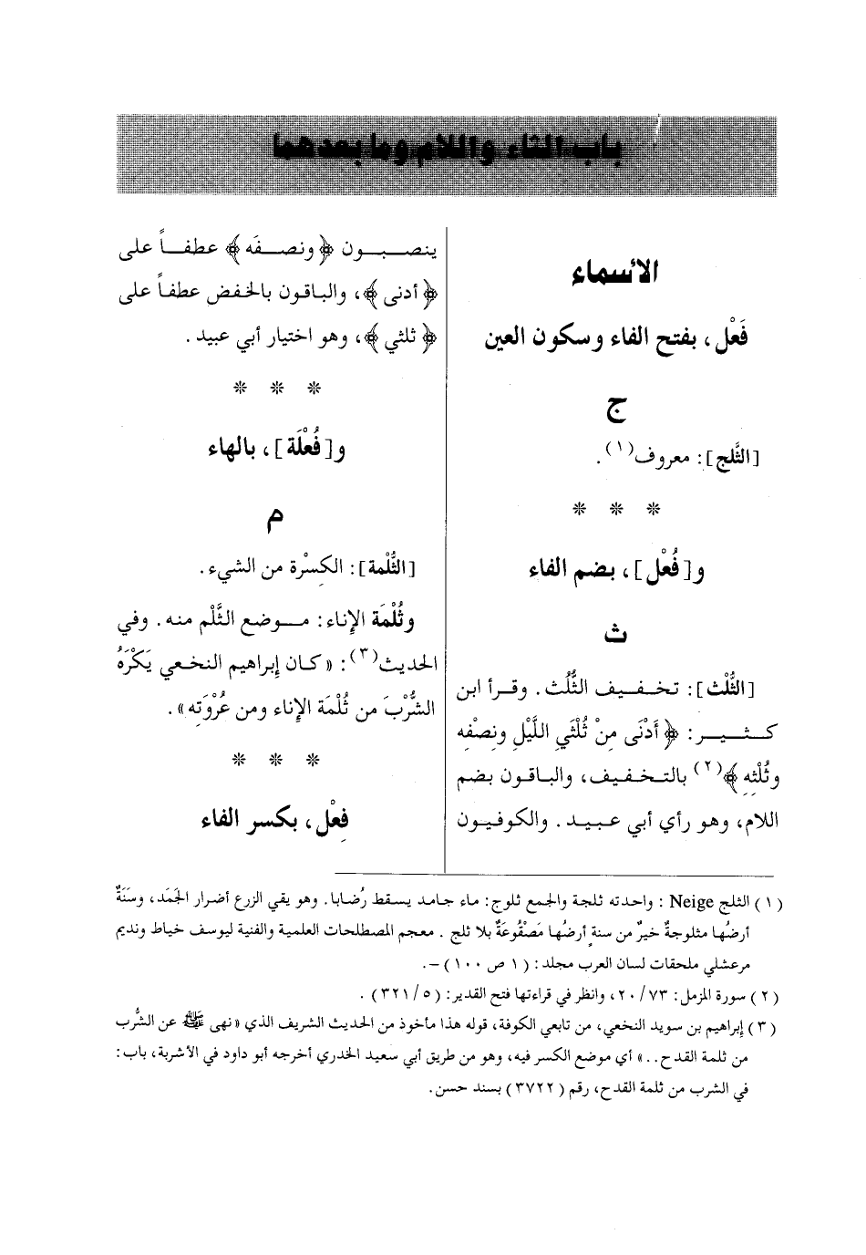 (1) الثلج Neige: واحدته ثلجة والجمع ثلوج: ماء جامد يسقط رُضابا. وهو يقي الزرع أضرار الجَمَد، وسَنَةٌ أرضُها مثلوجةٌ خيرٌ من سنةٍ أرضُها مَصْقُوعَةٌ بلا ثلج. معجم المصطلحات العلمية والفنية ليوسف خياط ونديم مرعشلي ملحقات لسان العرب مجلد: (1 ص 100) -.