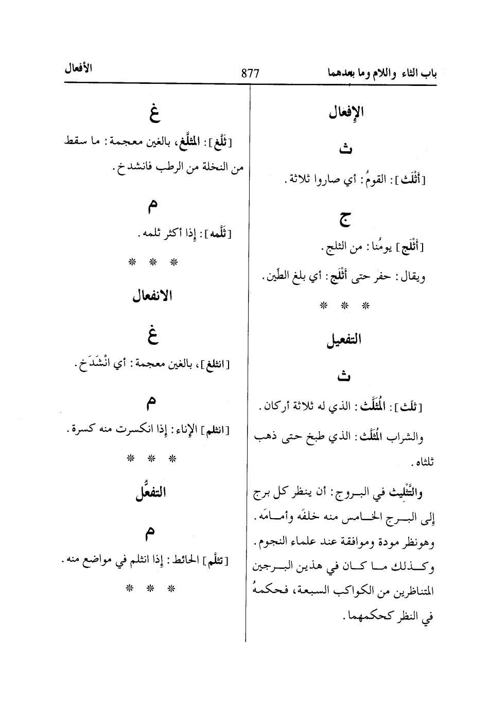[ثلّث]: المُثَلَّث: الذي له ثلاثة أركان.