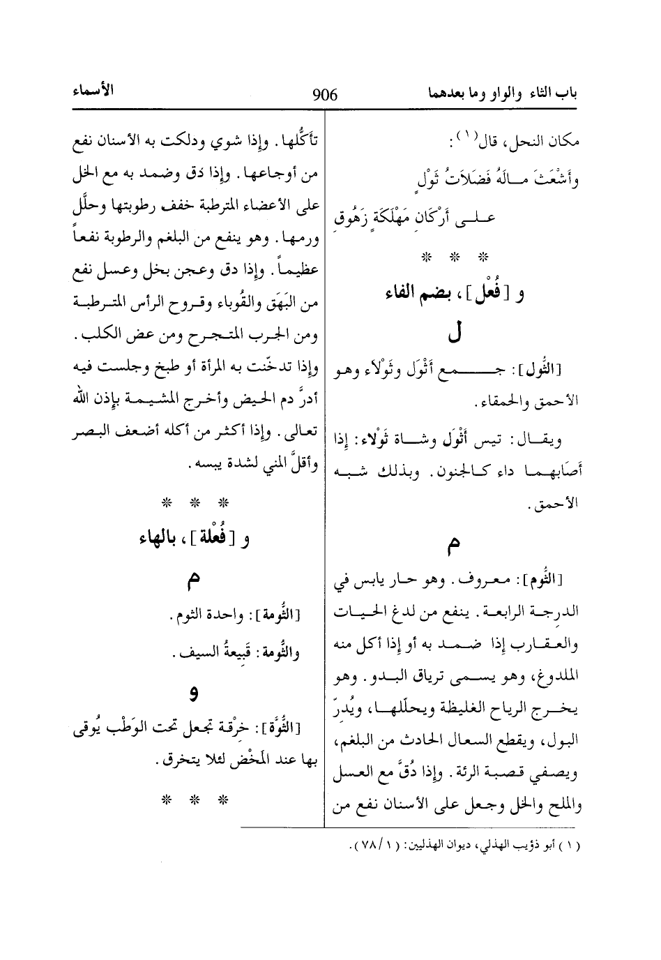 [الثُّوم]: معروف. وهو حار يابس في الدرِجة الرابعة. ينفع من لدغ الحيات والعقارب إِذا ضمد به أو إِذا أكل منه الملدوغ، وهو يسمى ترياق البدو. وهو يخرج الرياح الغليظة ويحلّلها، ويُدِرّ البول، ويقطع السعال الحادث من البلغم، ويصفي قصبة الرئة. وإِذا دُقَّ مع العسل والملح والخل وجعل على الأسنان نفع من تأَكُّلها. وإِذا شوي ودلكت به الأسنان نفع من أوجاعها. وإِذا دق وضمد به مع الخل على الأعضاء المترطبة خفف رطوبتها وحلَّل ورمها. وهو ينفع من البلغم والرطوبة نفعاً عظيماً. وإِذا دق وعجن بخل وعسل نفع من البَهَق والقُوباء وقروح الرأس المترطبة ومن الجرب المتجرح ومن عض الكلب.
