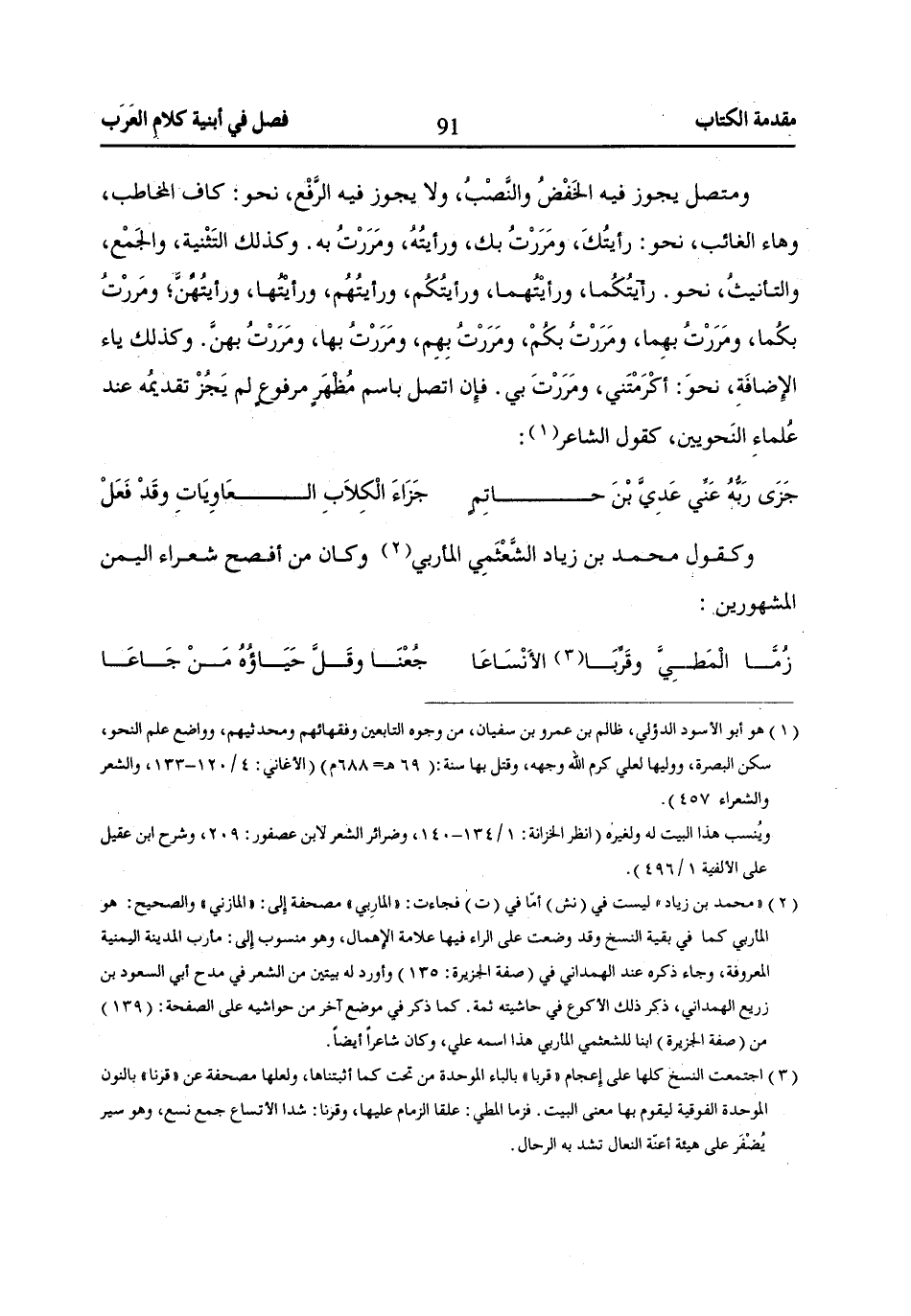 (2) «محمد بن زياد» ليست في (نش) أمّا في (ت) فجاءت: «المارِبي» مصحفة إِلى: «المازني» والصحيح: هو المأربي كما في بقية النسخ وقد وضعت على الراء فيها علامة الإِهمال، وهو منسوب إِلى: مأرب المدينة اليمنية المعروفة، وجاء ذكره عند الهمداني في (صفة الجزيرة: 135) وأورد له بيتين من الشعر في مدح أبي السعود بن زريع الهمداني، ذكر ذلك الأكوع في حاشيته ثمة. كما ذكر في موضع آخر من حواشيه على الصفحة: (139) من (صفة الجزيرة) ابنا للشعثمي المأربي هذا اسمه علي، وكان شاعراً أيضاً.