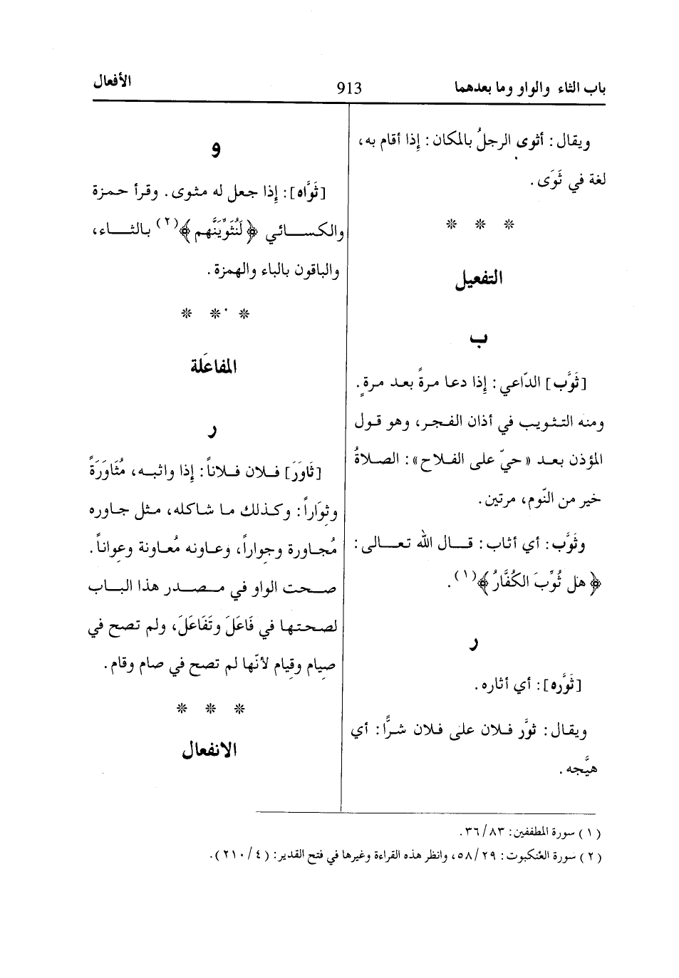 و [ثَوَّاه]: إِذا جعل له مثوى. وقرأ حمزة والكسائي لنثوّينّهم «2» بالثاء، والباقون بالباء والهمزة.