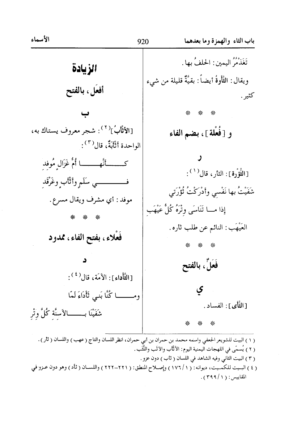 (4) البيت للكميت، ديوانه: (1/ 176) وإِصلاح المنطق: (221 - 222) واللسان (ثأَد) وهو دون عزو في المقاييس: (1/ 399).