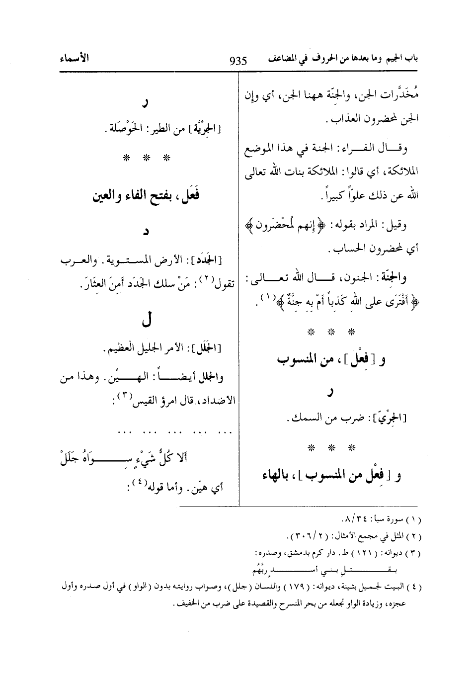 (4) البيت لجميل بثينة، ديوانه: (179) واللسان (جلل)، وصواب روايته بدون (الواو) في أول صدره وأول عجزه، وزيادة الواو تجعله من بحر المنسرح والقصيدة على ضرب من الخفيف.