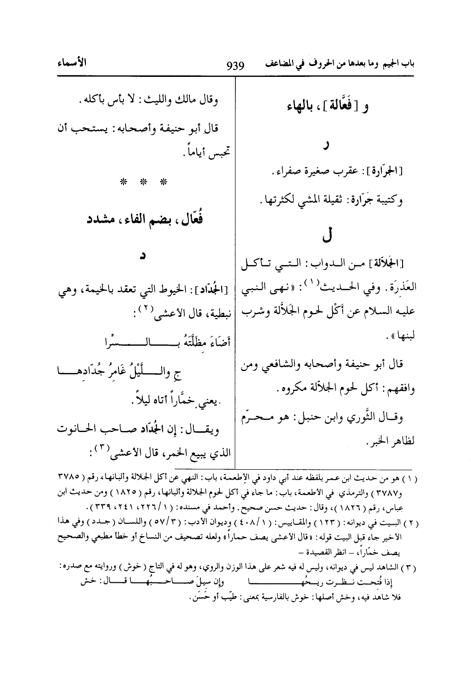 (2) البيت في ديوانه: (123) والمقاييس: (1/ 408) وديوان الأدب: (3/ 57) واللسان (جدد) وفي هذا الأخير جاء قبل البيت قوله: «قال الأعشى يصف حماراً» ولعله تصحيف من النساخ أو خطأ مطبعي والصحيح يصف خمّاراً، - انظر القصيدة-