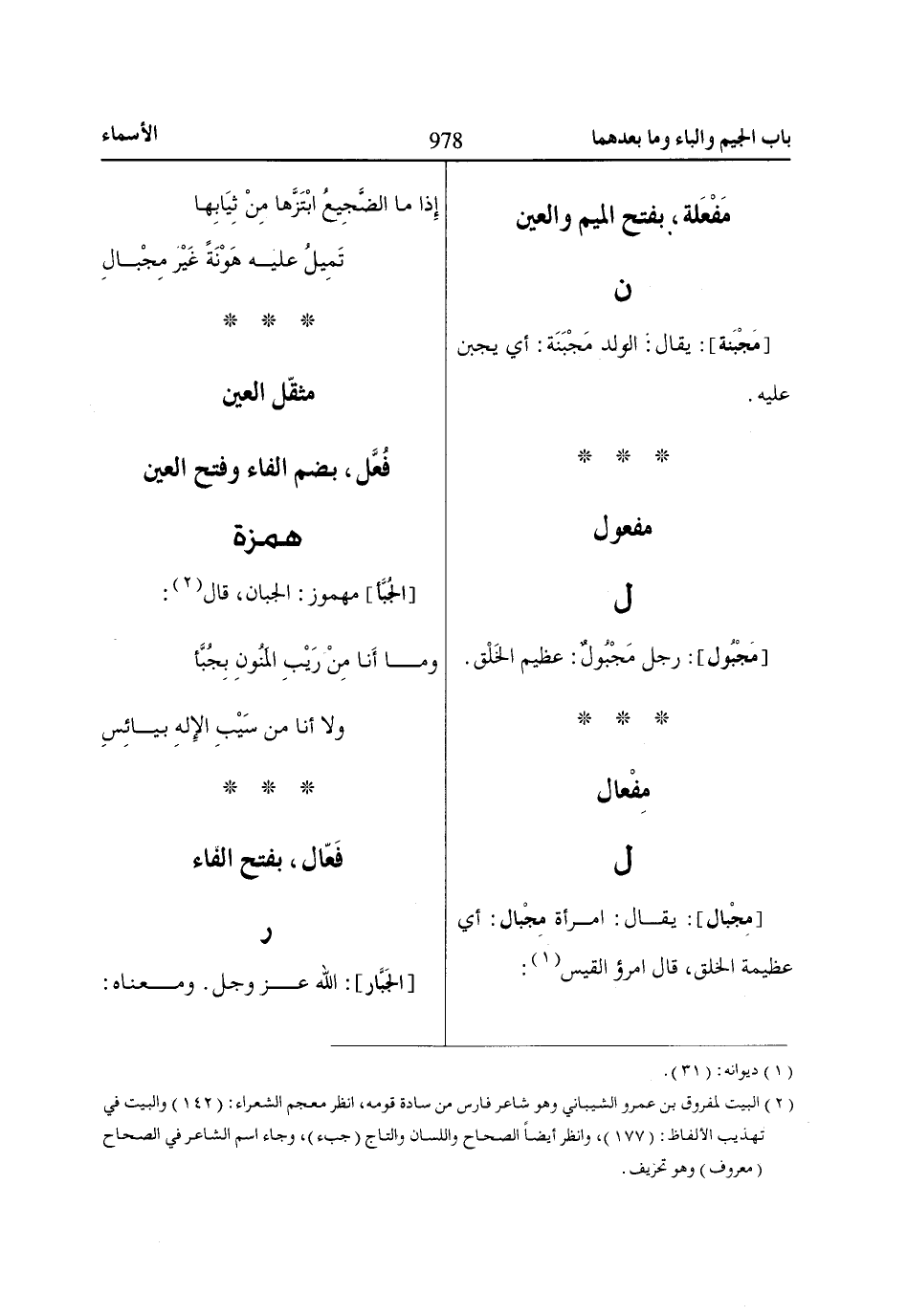 (2) البيت لمفروق بن عمرو الشيباني وهو شاعر فارس من سادة قومه، انظر معجم الشعراء: (142) والبيت في تهذيب الألفاظ: (177)، وانظر أيضاً الصحاح واللسان والتاج (جبء)، وجاء اسم الشاعر في الصحاح (معروف) وهو تحريف.