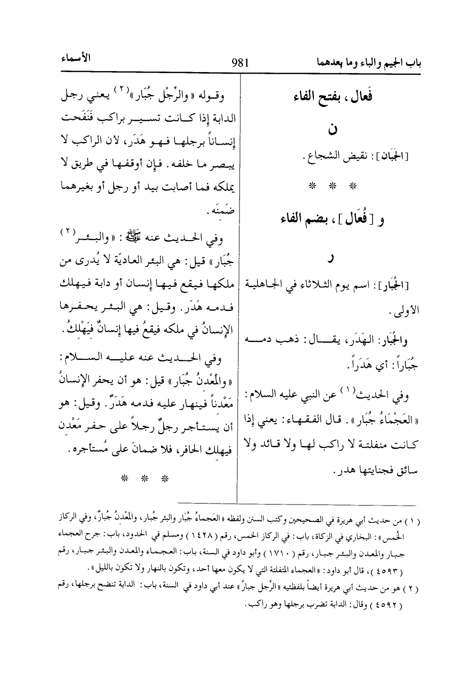 (1) من حديث أبي هريرة في الصحيحين وكتب السنن ولفظه «العَجماءُ جُبَار والبئر جُبار، والمَعْدِنُ جُبارٌ، وفي الركاز الخُمس»: البخاري في الزكاة، باب: في الركاز الخمس، رقم (1428) ومسلم في الحدود، باب: جرح العجماء جبار والمعدن والبئر جبار، رقم (1710) وأبو داود في السنة، باب: العجماء والمعدن والبئر جبار، رقم (4593)، قال أبو داود: «العجماء المتفلتة التي لا يكون معها أحد، وتكون بالنهار ولا تكون بالليل».