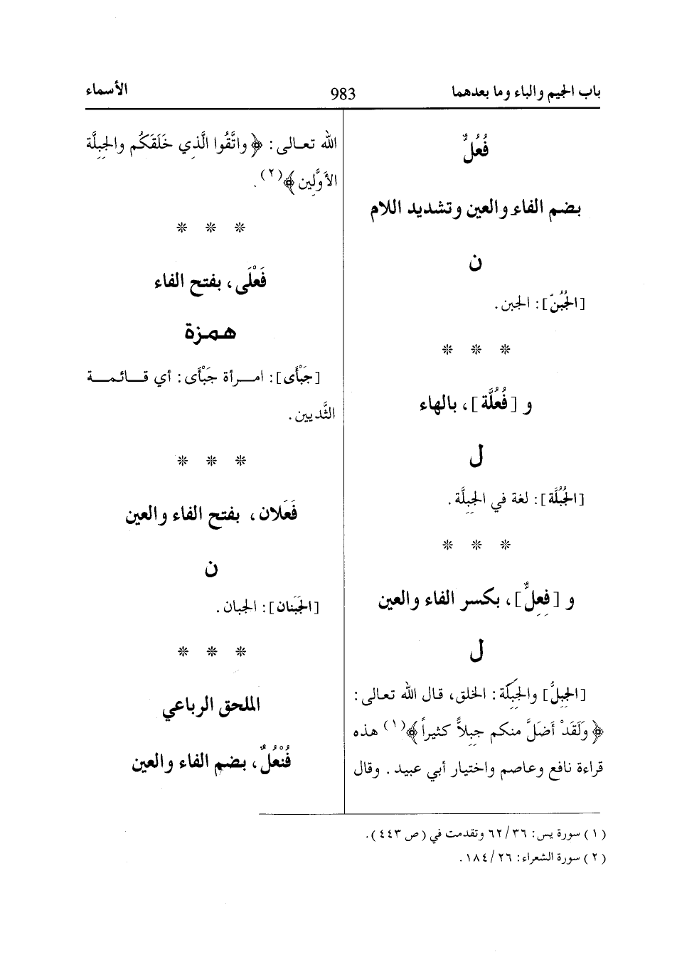 وَلَقَدْ أَضَلَّ مِنْكُمْ جِبِلًّا كَثِيراً «1» هذه قراءة نافع وعاصم واختيار أبي عبيد. وقال اللّاه تعالى: وَاتَّقُوا الَّذِي خَلَقَكُمْ وَالْجِبِلَّةَ الْأَوَّلِينَ «2».