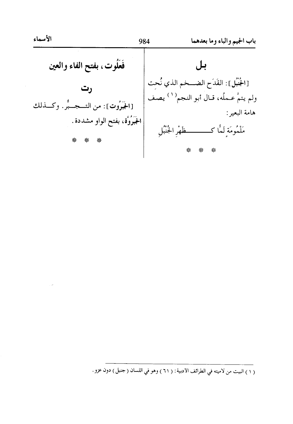 (1) البيت من لاميته في الطرائف الأدبية: (61) وهو في اللسان (جنبل) دون عزو.