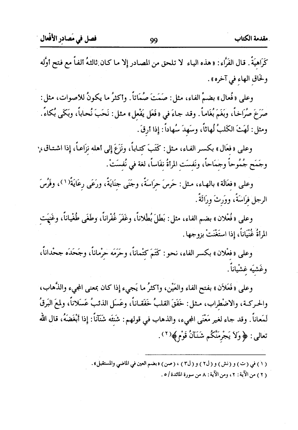 وعلى «فِعَال» بكسر الفاء، مثل: كَتَبَ كِتاباً، ونَزَعَ إِلى أهله نِزَاعاً، إِذا اشتاق، وجَمَح جُمُوحاً وجِمَاحاً، ونَفِسَتِ المرأةُ نِفَاساً، لغة في نُفِسَتْ.