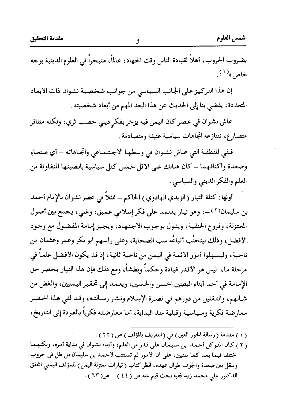 لقد كان نشوان يعلم حق العلم، أن الإِمامة بعد مؤسسها الهادي يحيى بن الحسين، قد ابتذلت وهانت حتى ادعاها من ليس أهلًا لها، فهذا زيد بن علي أحد