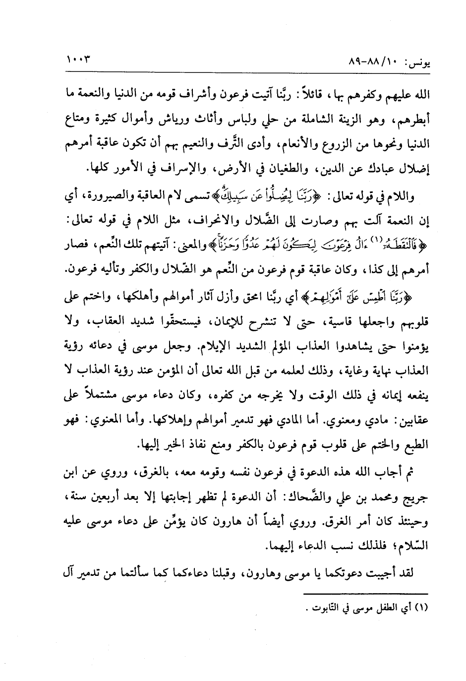 رَبَّنَا اطْمِسْ عَلى أَمْوالِهِمْ أي ربّنا أمحق وأزل آثار أموالهم وأهلكها، واختم على قلوبهم واجعلها قاسية، حتى لا تنشرح للإيمان، فيستحقّوا شديد العقاب، ولا يؤمنوا حتى يشاهدوا العذاب المؤلم الشديد الإيلام. وجعل موسى في دعائه رؤية العذاب نهاية وغاية، وذلك لعلمه من قبل الله تعالى أن المؤمن عند رؤية العذاب لا ينفعه إيمانه في ذلك الوقت ولا يخرجه من كفره، وكان دعاء موسى مشتملا على عقابين: مادي ومعنوي. أما المادي فهو تدمير أموالهم وإهلاكها. وأما المعنوي: فهو الطبع والختم على قلوب قوم فرعون بالكفر ومنع نفاذ الخير إليها.