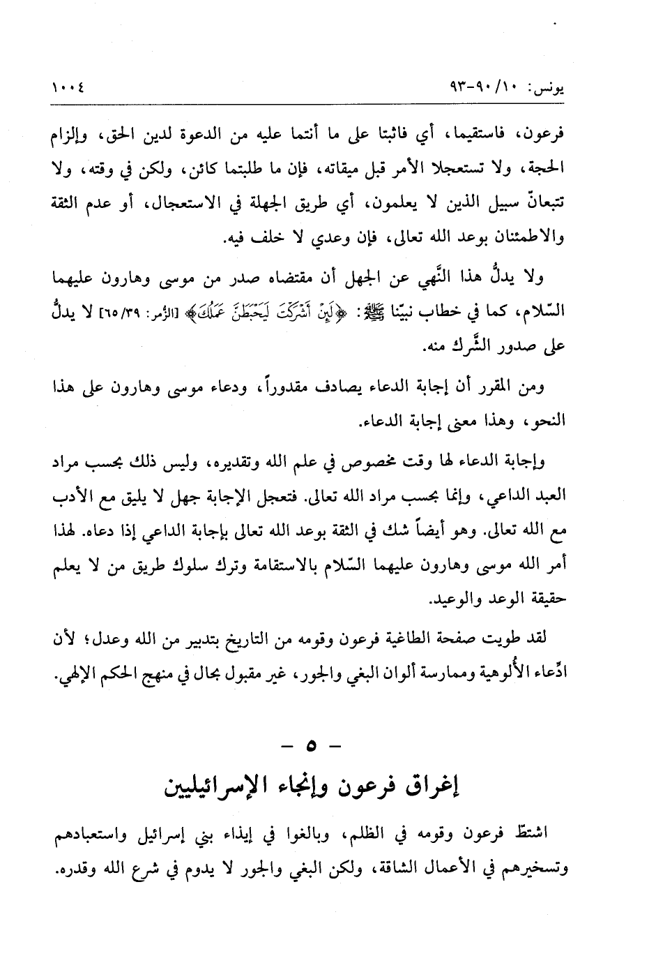 وإجابة الدعاء لها وقت مخصوص في علم الله وتقديره، وليس ذلك بحسب مراد العبد الداعي، وإنما بحسب مراد الله تعالى. فتعجل الإجابة جهل لا يليق مع الأدب مع الله تعالى. وهو أيضا شك في الثقة بوعد الله تعالى بإجابة الداعي إذا دعاه. لهذا أمر الله موسى وهارون عليهما السّلام بالاستقامة وترك سلوك طريق من لا يعلم حقيقة الوعد والوعيد.