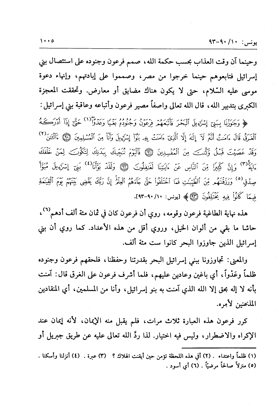 وَجاوَزْنا بِبَنِي إِسْرائِيلَ الْبَحْرَ فَأَتْبَعَهُمْ فِرْعَوْنُ وَجُنُودُهُ بَغْياً وَعَدْواً حَتَّى إِذا أَدْرَكَهُ الْغَرَقُ قالَ آمَنْتُ أَنَّهُ لا إِلهَ إِلاَّ الَّذِي آمَنَتْ بِهِ بَنُوا إِسْرائِيلَ وَأَنَا مِنَ الْمُسْلِمِينَ (90) آلْآنَ وَقَدْ عَصَيْتَ قَبْلُ وَكُنْتَ مِنَ الْمُفْسِدِينَ (91) فَالْيَوْمَ نُنَجِّيكَ بِبَدَنِكَ لِتَكُونَ لِمَنْ خَلْفَكَ آيَةً وَإِنَّ كَثِيراً مِنَ النَّاسِ عَنْ آياتِنا لَغافِلُونَ (92) وَلَقَدْ بَوَّأْنا بَنِي إِسْرائِيلَ مُبَوَّأَ صِدْقٍ وَرَزَقْناهُمْ مِنَ الطَّيِّباتِ فَمَا اخْتَلَفُوا حَتَّى جاءَهُمُ الْعِلْمُ إِنَّ رَبَّكَ يَقْضِي بَيْنَهُمْ يَوْمَ الْقِيامَةِ فِيما كانُوا فِيهِ يَخْتَلِفُونَ (93)